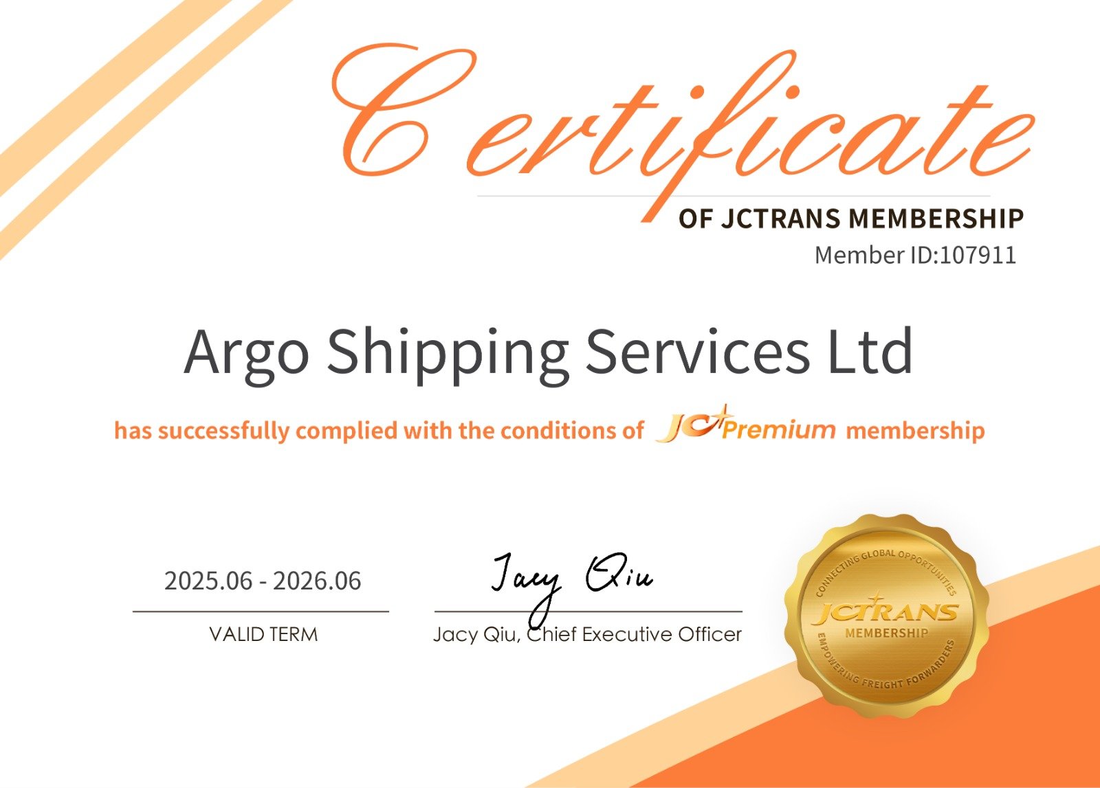 Argo Shipping is honored to be a certified member of JCTRANS, with Member ID: 107911. This membership is a testament to our commitment to excellence and adherence to the highest standards in freight forwarding services.